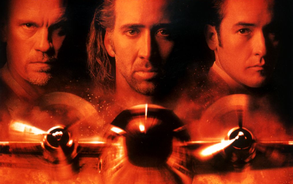 Nicolas Cage’s performance as Cameron Poe could be read as being both good and bad, depending on your tolerance of Cage’s equally ridiculous hair and accent. Why they made Cage, a California native, into a southern Alabama red neck is beyond me, but when the whole film is ridiculous this really doesn’t stand out. Con Air also stars other great actors along side Cage, including John Malkovich as insane villain Cyrus ‘The Virus’. He’s hams it up as much as Cage and turns in an extremely memorable performance. Other characters include Diamond Dog, a militant black dude with a hatred of white people played awesomely by Ving Rhames, Steve Buscemi pops up as mass murderer Garland Greene, who questionably gets away scot-free at the end despite, and I quote, ‘driving through 3 states wearing a little girls head as a hat.’ Other actors include Colm Meaney, Danny Trejo, Dave Chappelle and John Cusack. Cusack is one of the best characters in the film, playing U.S Marshall Vince Larkin and turns in the kind of great performance that made him great in the brilliant Grosse Pointe Blank. Con Air is similar to many other Cage films and 80’s and 90’s action films in general; it’s endlessly quotable. There are some great lines in the film (BIlly: You lost your mind? Cyrus: According to my last psych evaluation, yes.) And there are some terrible ones, (Cage: She’s my hummingbird.) But they’re all awesome in the context of the film and the really add to its over the top nature.