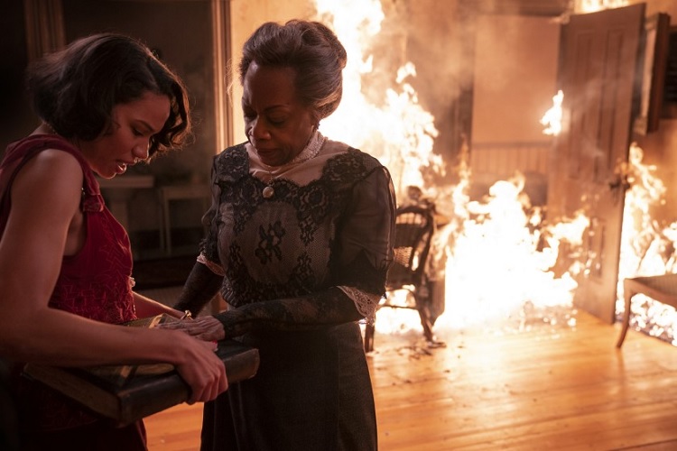 She has the choice to warn her family, or trust this stranger and secure the life of her family to come. Hattie accepts her circumstances and allows Leti to have the book. I think the way she is so quick to believe is a testament to her faith, as we soon learn she is a devoutly religious woman. Upon learning about Leti’s pregnancy, with her great-great granchild, Hattie declares “When my great-great grandson is born, he will be my faith turned into flesh.” She explains that the book is protected by a spell, and that she had been instructed to guard it but not open it. Her and Leti hold hands and begin to pray as the fire engulfs them both. It’s a tragic scene as Hattie burns, but also a powerful one, as we understand the weight of her sacrifice and the love she holds for her family, even those yet to be born.