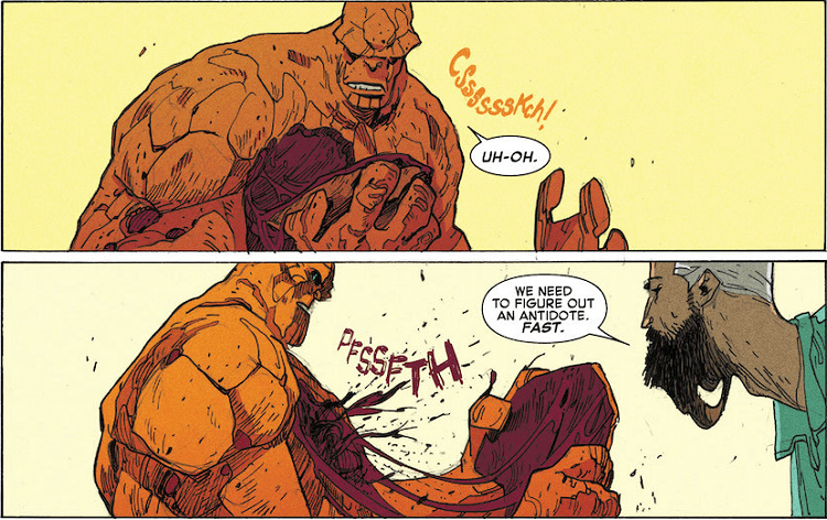 The art from Filipe Andrade is exceptional. At first it took me back, because many of the character were drawn almost as caricatures, with Reed being spindly and tall. But as it went on, I fell in love with the style, with the way it conveyed each character’s different traits and abilities. And the gruesome body-horror? Well it takes talent to be that gross.