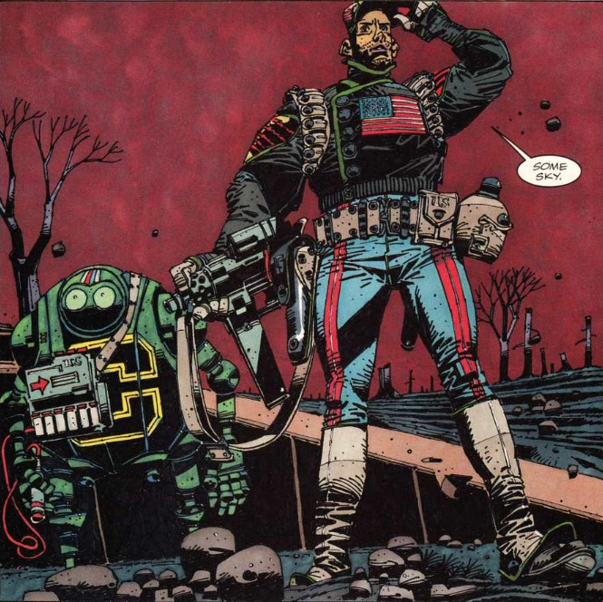 And it is really something. Anti-war, anti-America, anti-religion, utterly bleak and nihilistic – this is definitely a British comic. It follows in the wake of the nuclear apocalypse, in which a cryogenically frozen US soldier is awakened to restore order and reinstate the American way of life.
